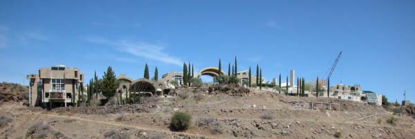 Arcosanti is the brainchild of architect Paolo Soleri, a former apprentice of Frank Lloyd Wright. It was designed to address the continued problems of urban sprawl and dependency on cars. In its final stage, its 3 dimensional structures are designed to house 7000 people in a pedestrian based town built on about 24 acres of desert land north of Phoenix. The land is quite unforgiving, but has access to an underground river for water and there is some topsoil in the valley below.
