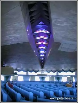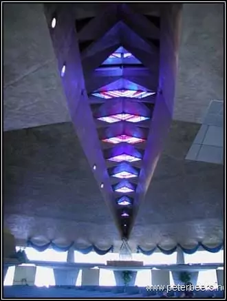 The skylights and the way the alter is set up is really quite beautiful. I think the posters on either side of the alter take away from the beauty of the building, but they serve the purposes of the congregation.