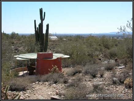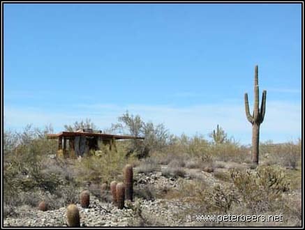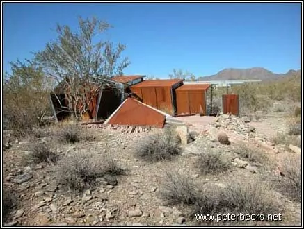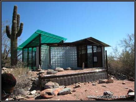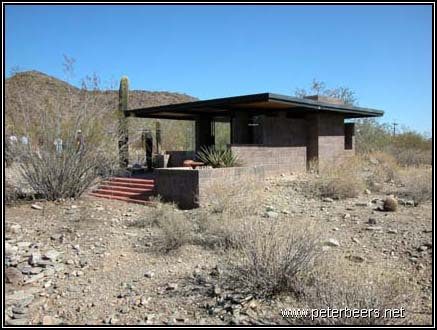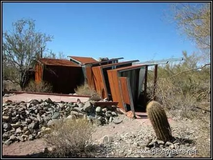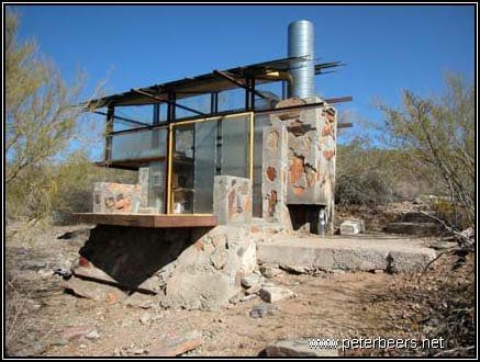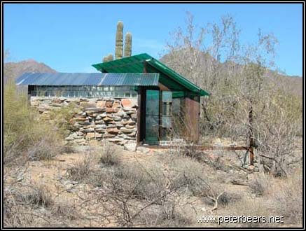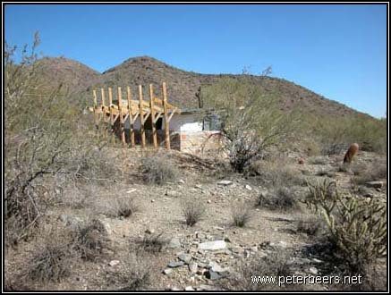 This shelter had a significant “desert rumblestone” foundation. The walls and foundation were formed by making plywood forms and filling them with rocks. Concrete was then poured over the rocks and then left to set. Most of the buildings at Taliesin West were built this way.