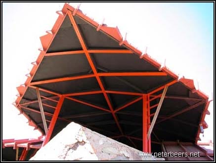 Overhang of steel roofed shelter.