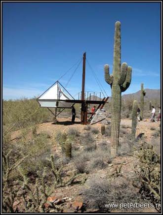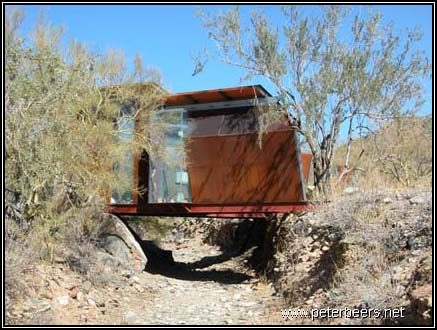 Certainly this is one of the strangest shelters on site. The living space is suspended from the steel I-beams with thick steel cables. It is steadied by other cables so it doesn’t swing around in the wind too much.