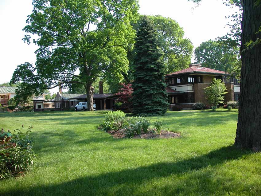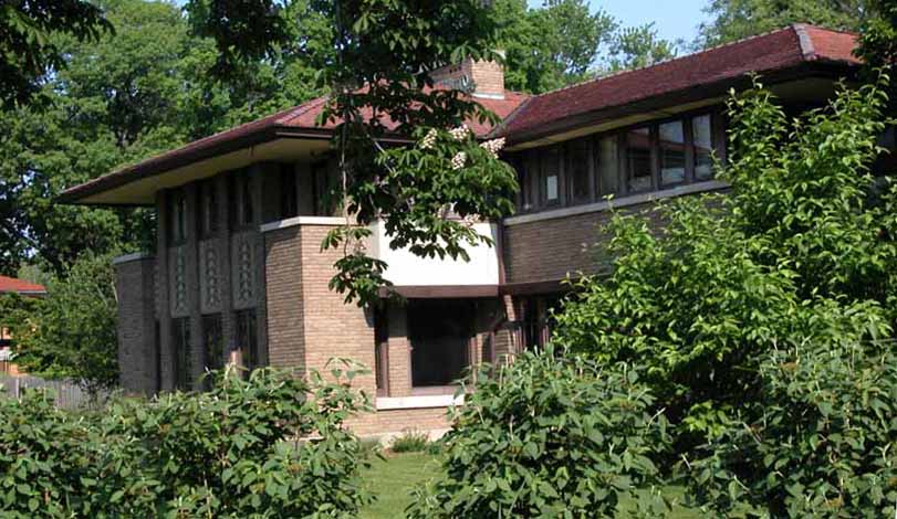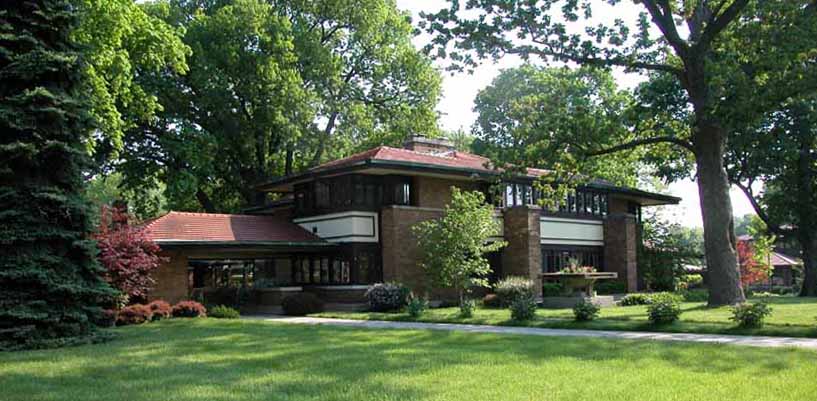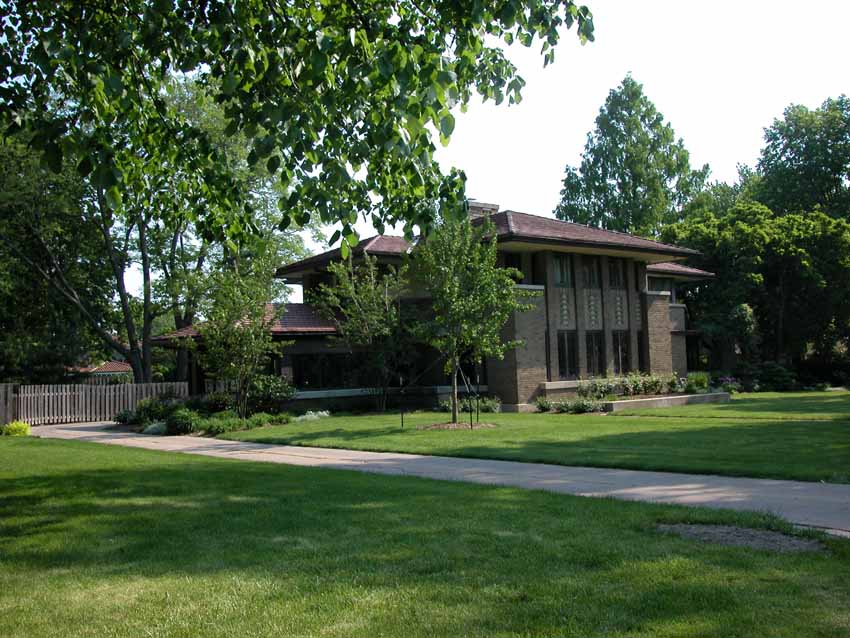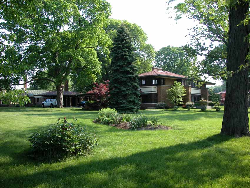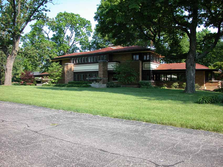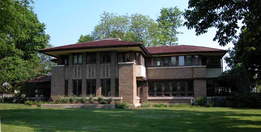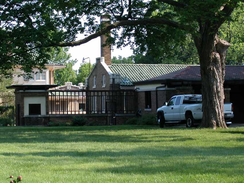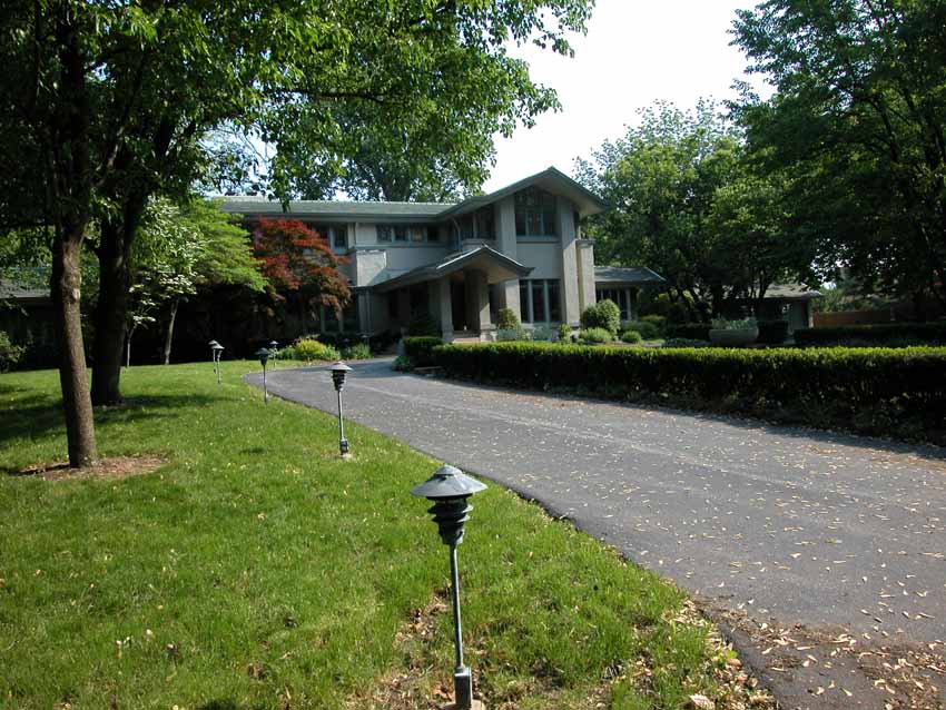 William Allin Storrer tells a very interesting story of this house. This home was designed in 1909 and was the last home that Wright worked on before leaving for Europe with Mamah Cheney. It was one of the few homes where Wright was given a complete free hand. He designed the home, the furnishings and even the uniforms worn by the servants. Construction on the home started in 1910 and was overseen by Marion Mahony and Hermann von Holst who worked in Wright’s firm and took up many of his commissions after he skipped town for Europe. Walter Burley Griffin designed the landscape for the home. There were some changes made to the design in Wright’s absensce.