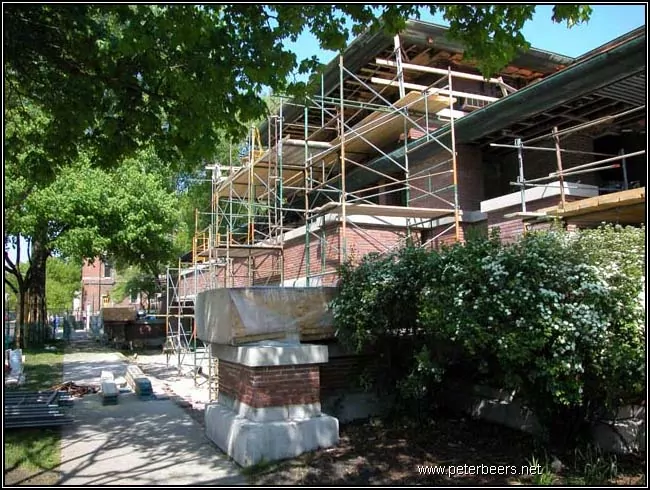 The “prow” of the house is being braced as thestructure of the roof is rebuilt. This is actually where the current tourentrance to the house is. The door in use right now was originally awindow, but since the original entrance had been changed numerous times byprevious owners, it is going through some of the most intensive renovation.