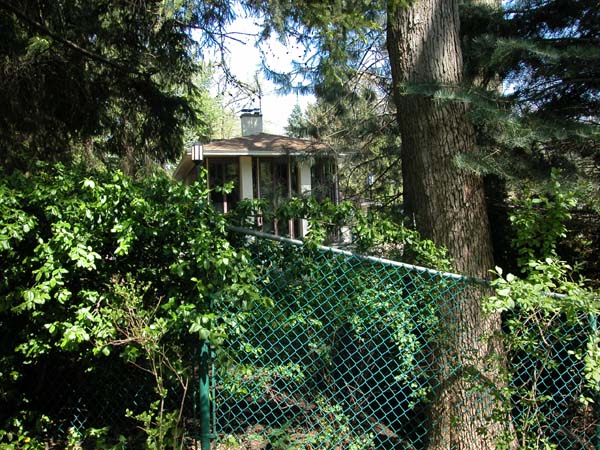 This is a neat house. When I visited it, there wasn’t much room to park and photograph it, so I had to shoot from inside the car (as you can see from the mirror appearing in the photo below). It is also located in the woods, so it is fairly well hidden from the street. I can understand that it would be a horrible house to try to heat in the winter time. The glass would definitely make it a bit drafty. That said, this two bedroom, 1-bath house would be perfect for a summer get-away home near lake michigan. I guess that was the whole idea. :D