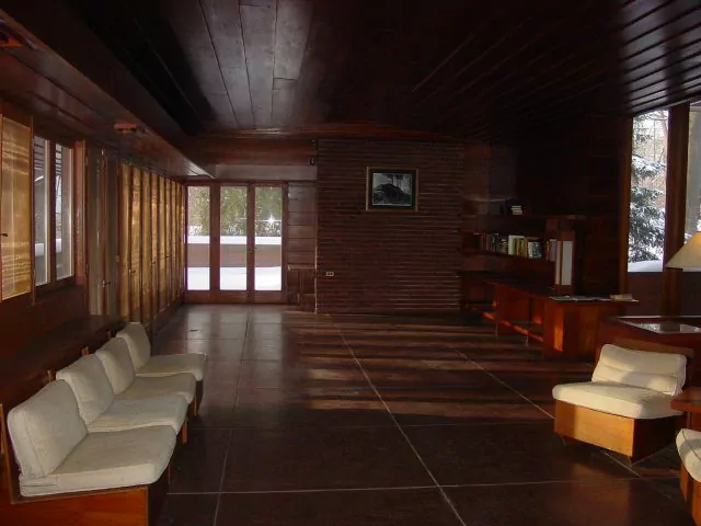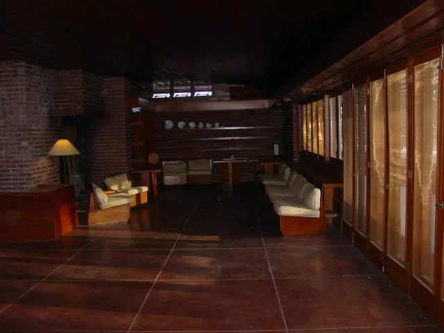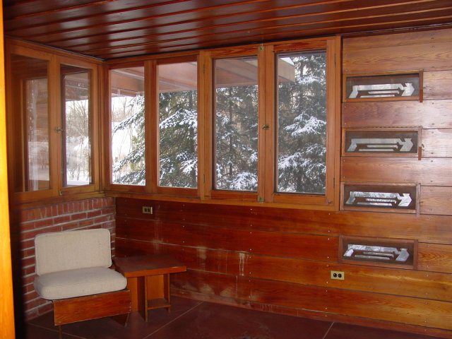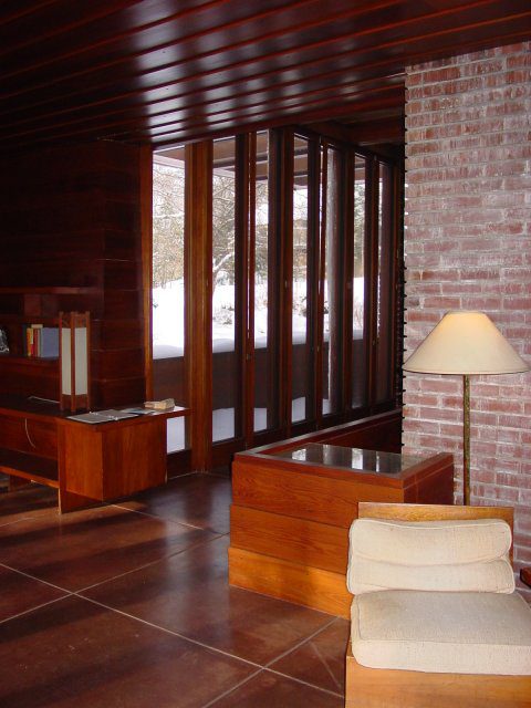 Thomas Heinz identifies one of the unique features of this mostly brick Usonian home in his book “The Vision of Frank Lloyd Wright” when he described a pond that is visible only by looking over a wall and straight down. Though Wright often includes “water features” in his homes, this one was quite unique in its implementation.