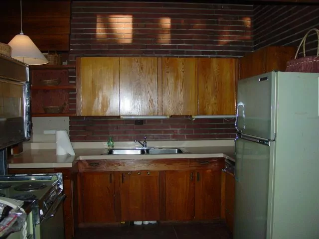 Victoria liked the groovy 1970s avocado appliances. The cabinets are original 1940’s vintage. Most of the wood work was done with high-grade, experimental plywood.
