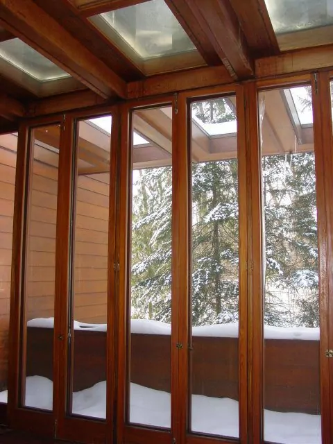 This view looks into the back yard. The floor to ceiling doors, windows and skylights make this an area that really brings nature into the house. There is even a glass door built into the floor that leads down to the reflecting pool. In the summer, the doors could be opened to create an updraft to cool the house. This eliminated the need for air conditioning.