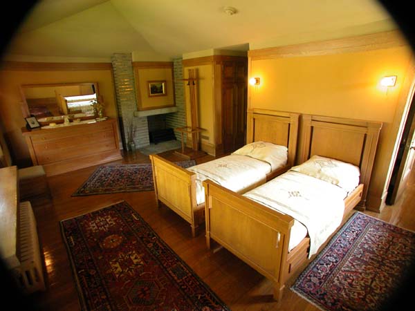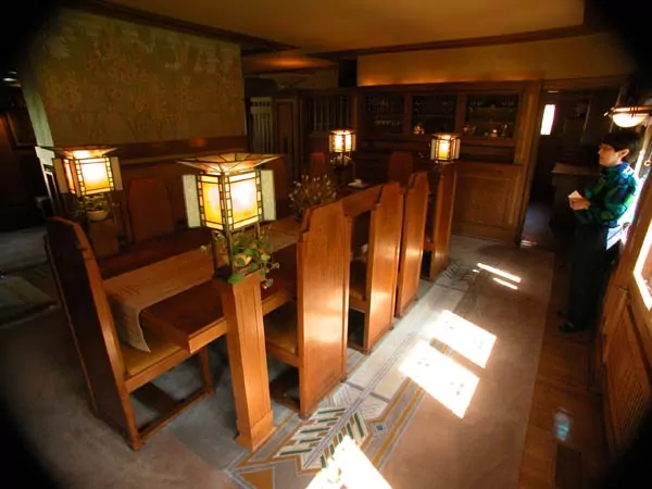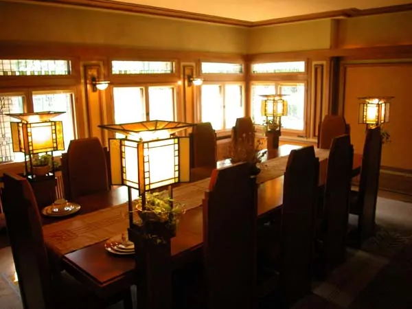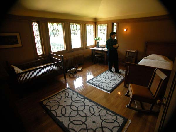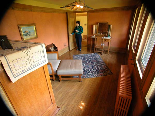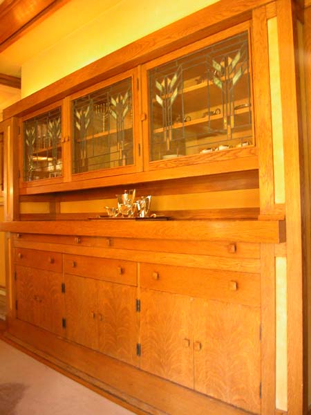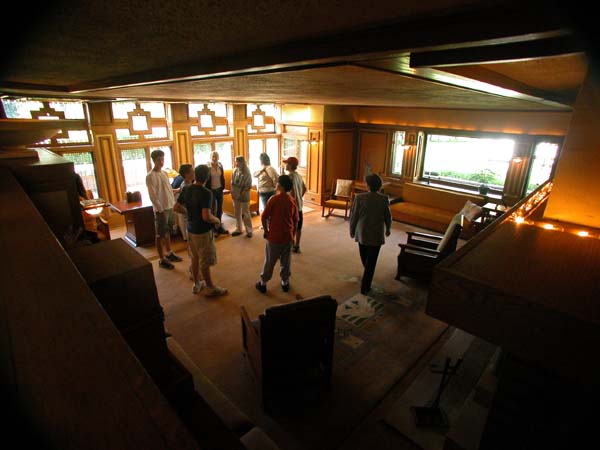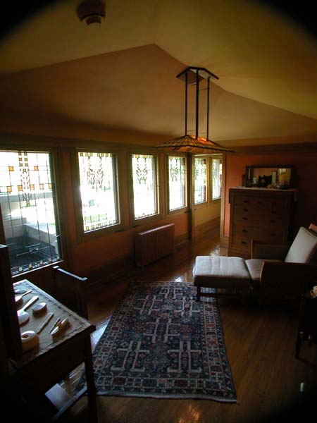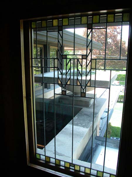 Then along came Steelcase. They are the company that had built the furniture for Frank Lloyd Wright’s Johnson Wax company. They purchased the home in 1985 and began the restoration. The 1922 addition was carefully removed, preserving all of the art glass windows that are still in storage. The roof was shored up with steel and new tiles of the same kind as the originals were installed on the roof. Amazingly enough, the company that made the original tiles is still in business and is still making roofing tiles of the same shape. Steelcase opens the house to the public in 1987. The restoration of the Meyer May house is almost perfect. The only noticeable difference is in the kitchen. Since Steelcase uses the home for catered functions, the kitchen must be very modern and also isn’t included in the tour of the house.