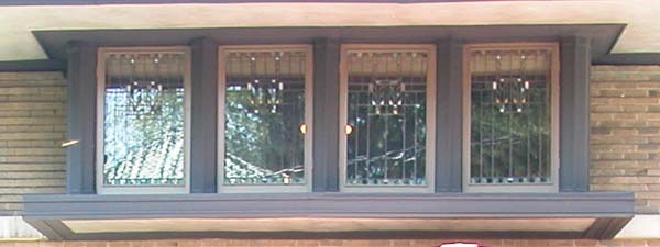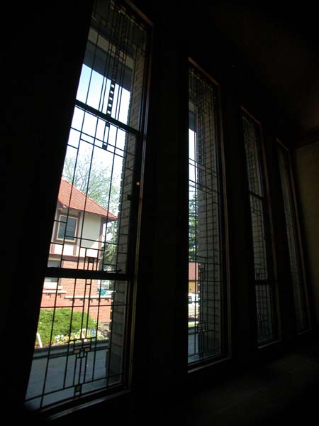 Where-as the other homes in the neighborhood are overwhelmingly vertical, The Meyer May house, like most of Wright’s Prairie homes, emphasizes the horizontal line. The long, overhanging eaves give shade from the summer sun and draw the eyes outward rather than upward. The bands of windows around the house give no indication of how many rooms there are inside, nor what their use is.