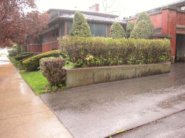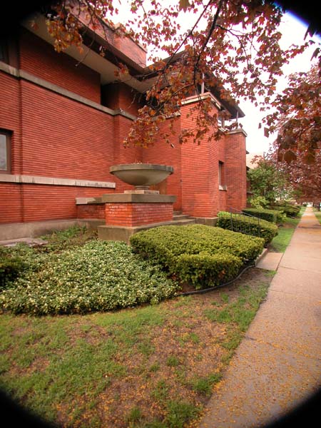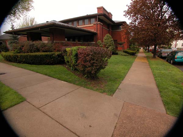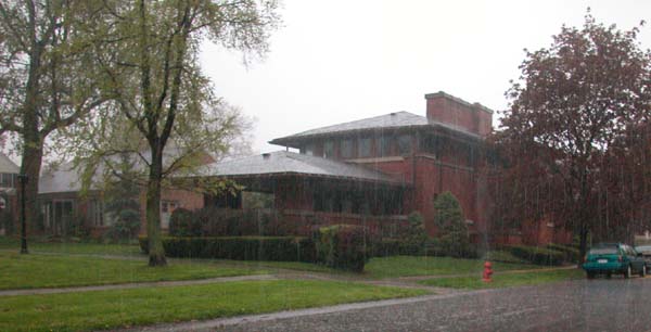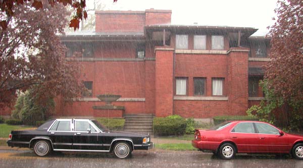 Why is it that it ALWAYS rains when I visit Buffalo??? As you can see from these photos, it was pouring rain when I photographed the William R. Heath house. This house is in a VERY fancy neighborhood. It was built in 1905 on a long, narrow lot on a large traffic circle. That pretty much insured that nothing would be built in front of it. The front porch, living room and upper band of art glass windows face the circle and provide the view.