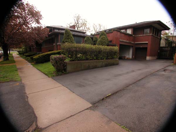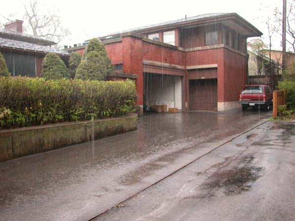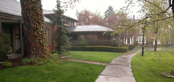 The private side of the house (away from the street) is quite crowded by the home next door. The Prairie style house has many windows on the side that faces away from the street, but remains much less open on the public side.