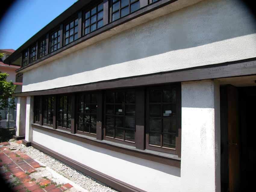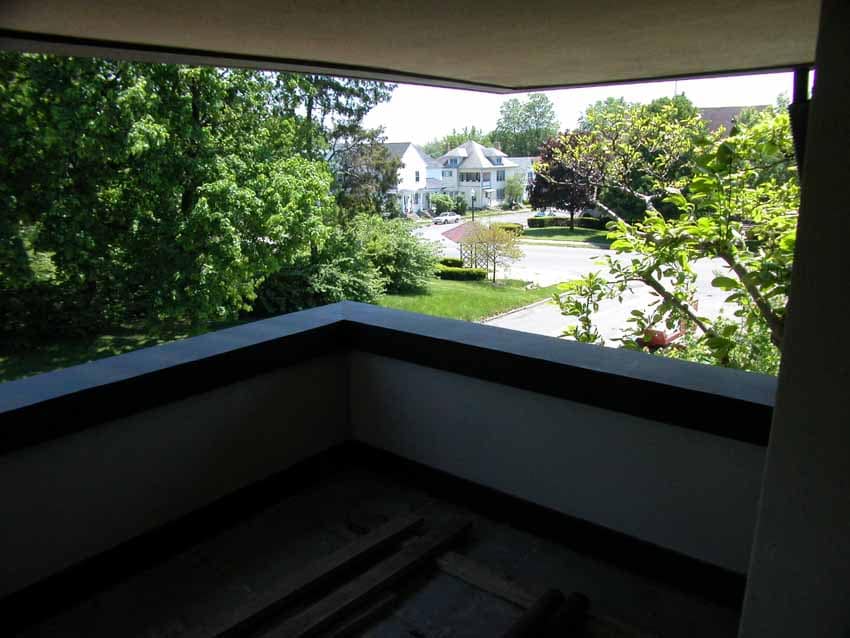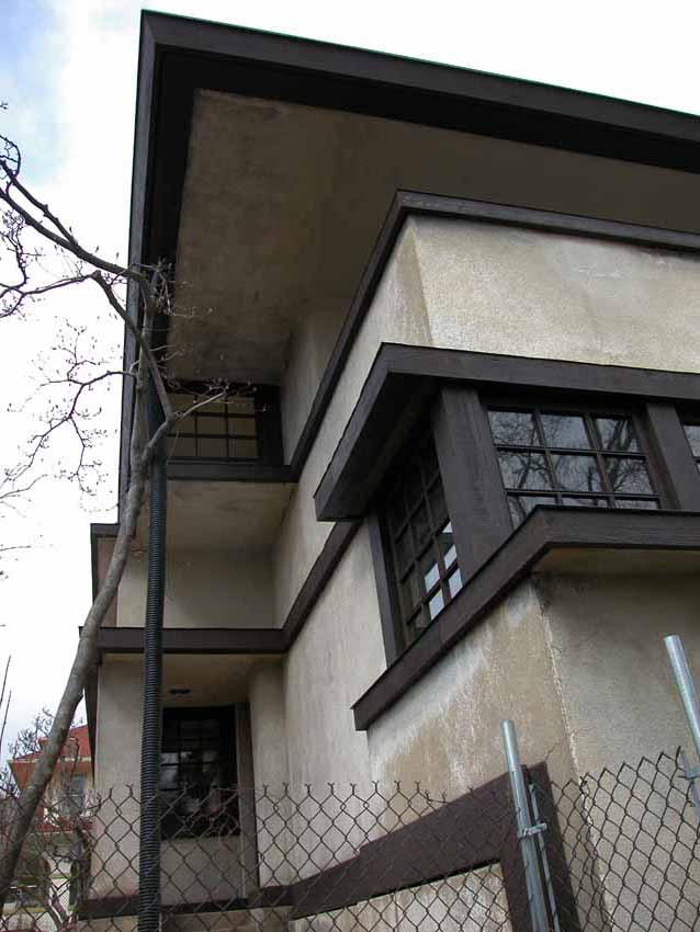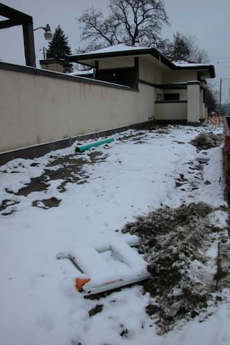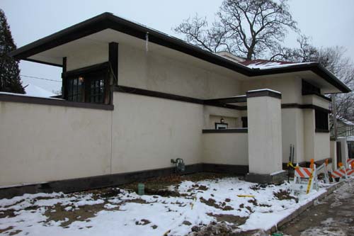 This is the west side of the house. Thanks to the way the water drained off the parking lot next door, this whole end was complete rotted out. It has been replaced and the new facing looks great. The planter is ready for some plants when they get to that point. You can definitely see how Wright built close to the lot line. There is barely 6″ between the house and the lot line. Amazing.