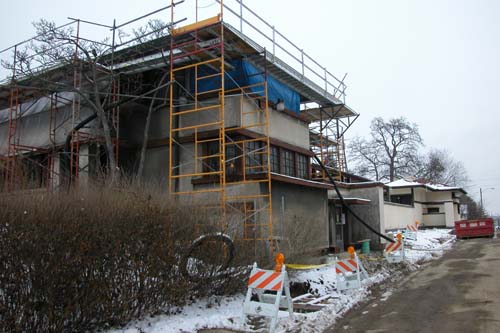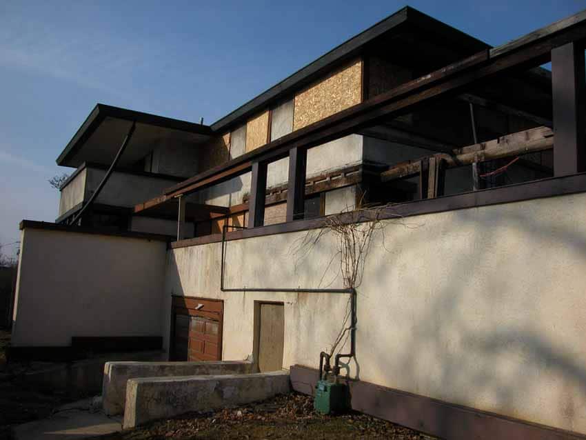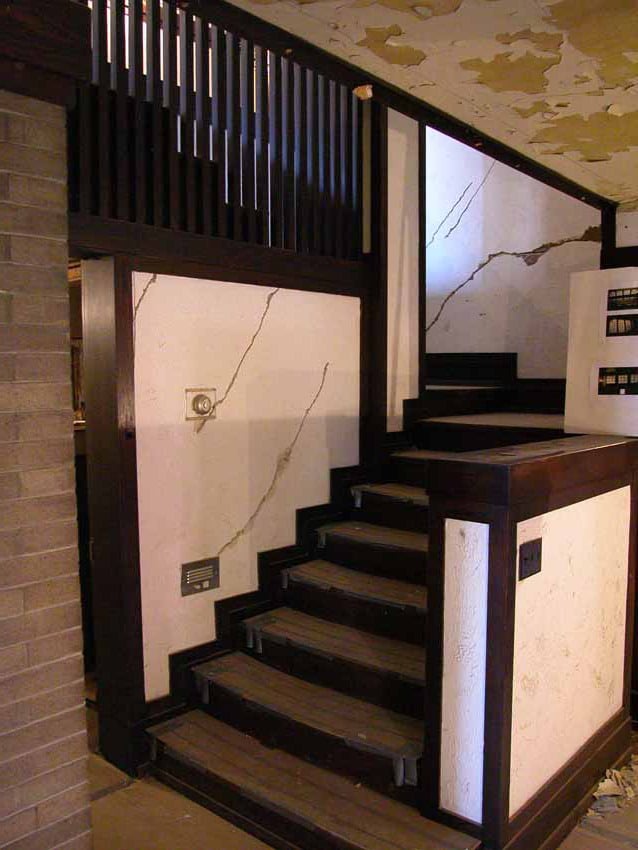 The front of the Westcott house. This is the side that faces the street. Much of the concrete and tile work around the terrace has crumbled and is being rebuilt. The amazing thing about this photo is that the rows of windows and the horizontle beams are now straight. You’ll see what I’m talking about when I get to the basement.