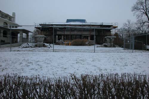 Looking at the back of the Westcott house from the carriage house. The pergola has been dismantled and will be rebuilt when that phase of the restoration comes along. The windows are boarded up because they are all off being restored. The portion of the house at the right of this photo is covered in plastic because that was where an addition was constructed.