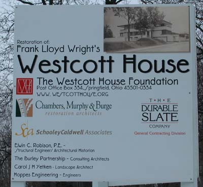 As a note to others who visit the Westcott House and otherWright buildings, please respect the posted signs and fences. I often walkup to the property line, but I always respect the owners wishes andprivacy. It was obvious to me in this instance that the Westcott HouseFoundation has had trouble with Wright fanatics crossing the fence andtrespassing on their property. This not only is dangerous and illegal, butalso it inhibits their ability to conduct their restoration. Thanksfor respecting their wishes.