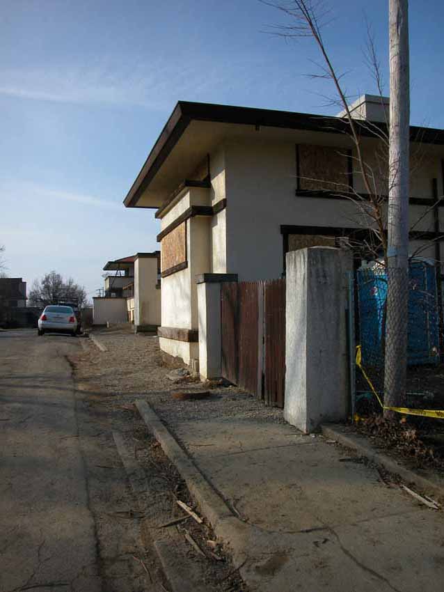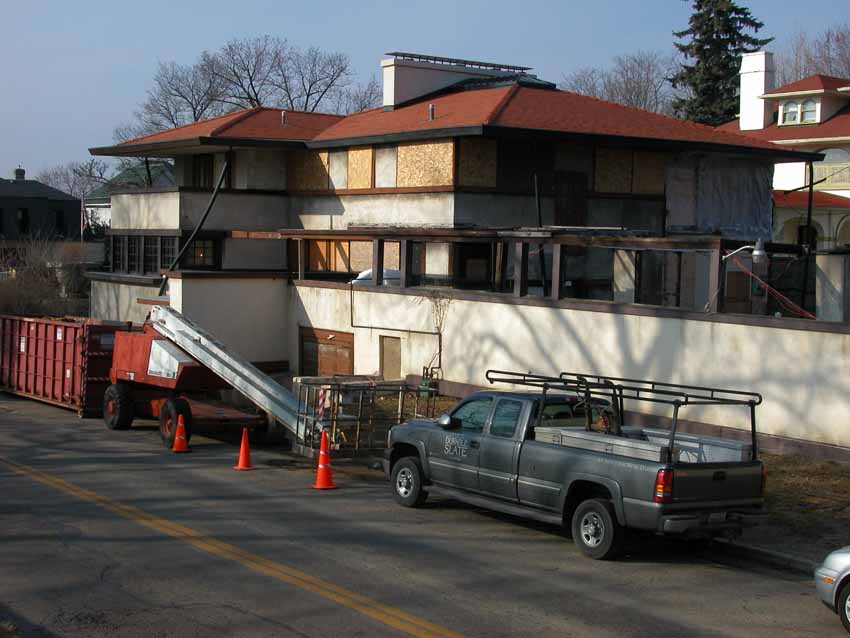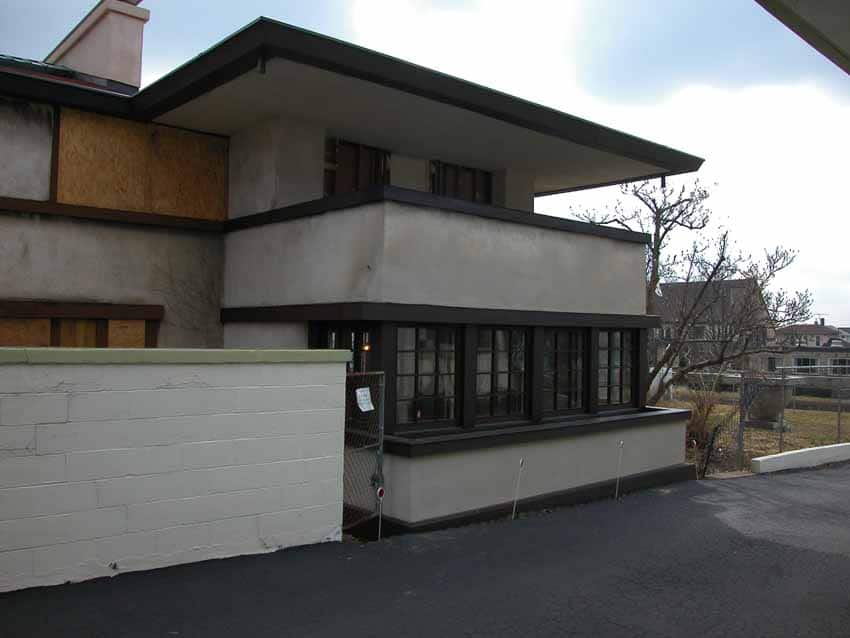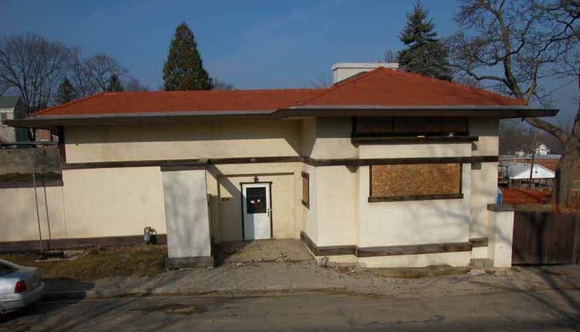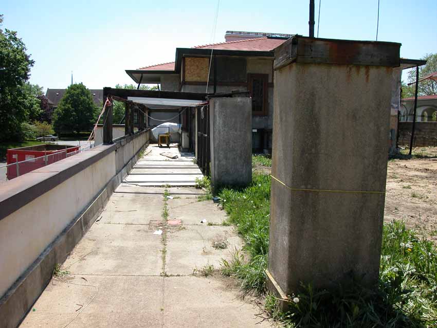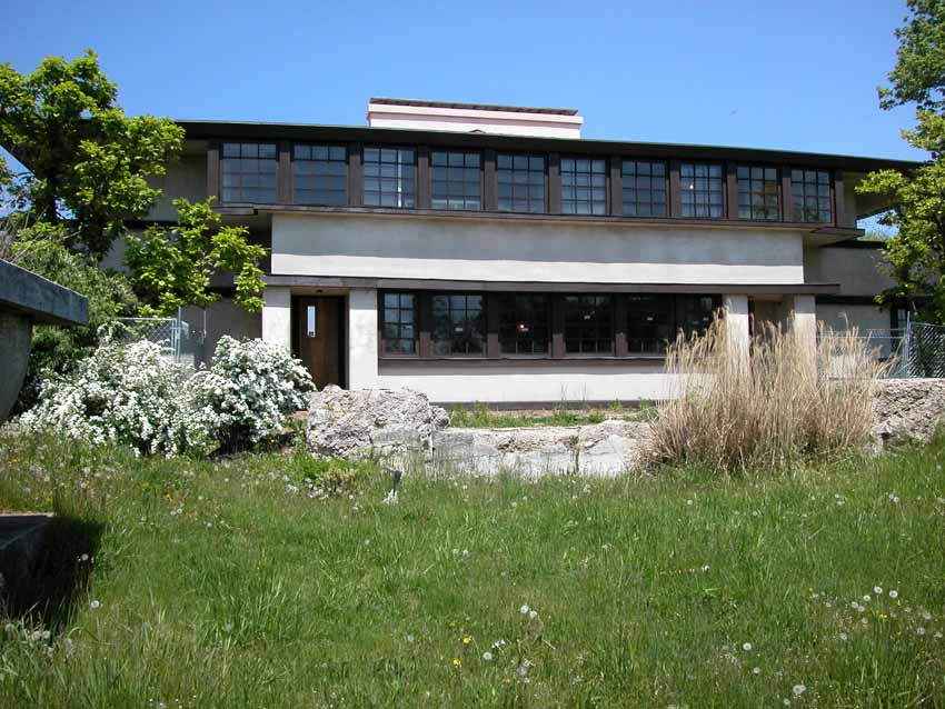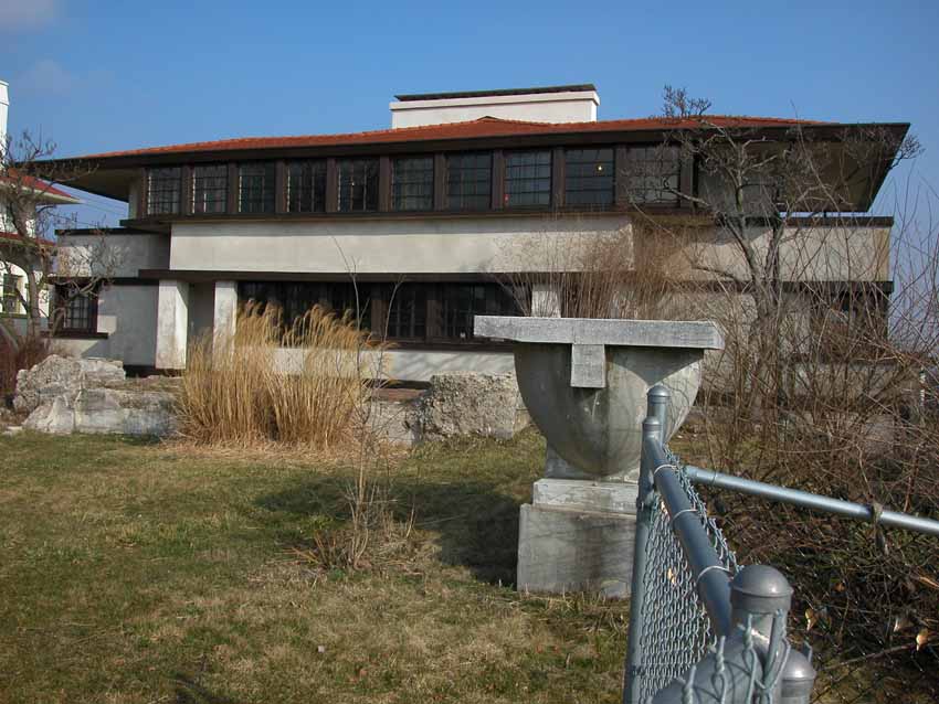 In its original form, it was a perfect representation of whatWright’s idea of organic architecture. Its use of terraces, gardens, poolsand a pergola helped it be in harmony with its environment. Wrightincluded the home in the “Wasmuth Portfolios” published in Europe in1911. You really have to use your imagination to see that now. Onlythe large urns remain out front at this point.