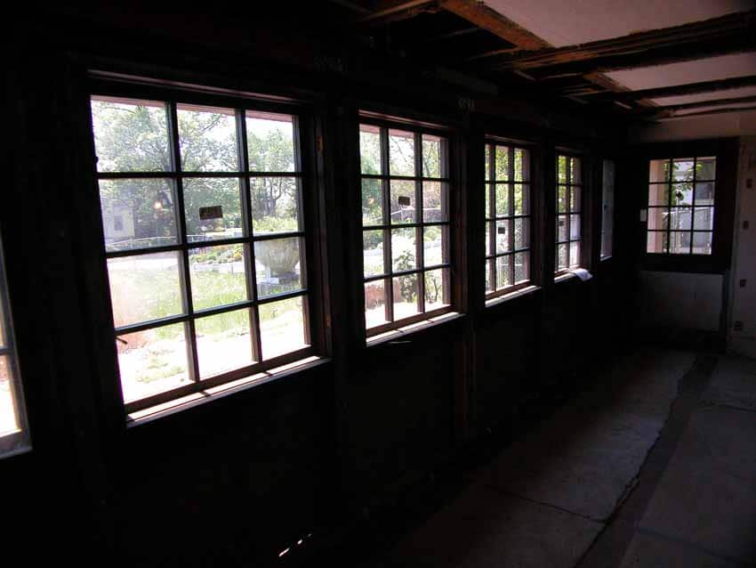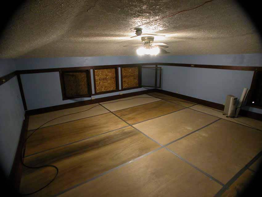 Upstairs bedroom in the carriage house. The floors are covered in plywood since the home was being shown to the public the next weekend. As I said before, the windows were removed for restoration. They’ll be back soon. The windows are larger since they face the private side of the house.