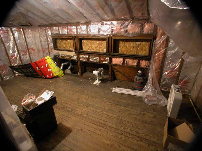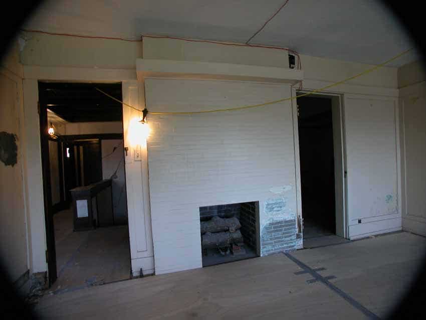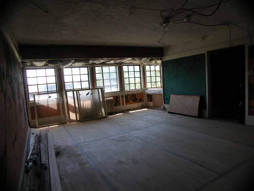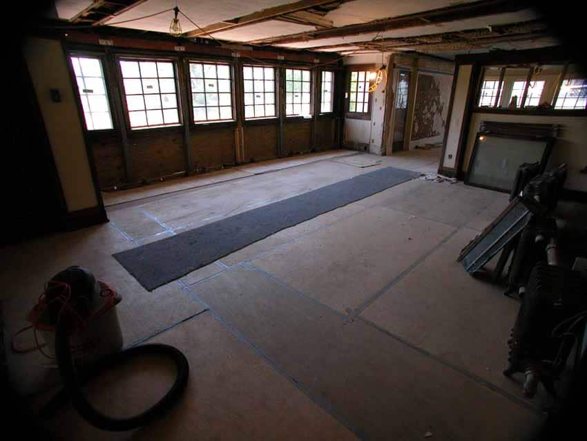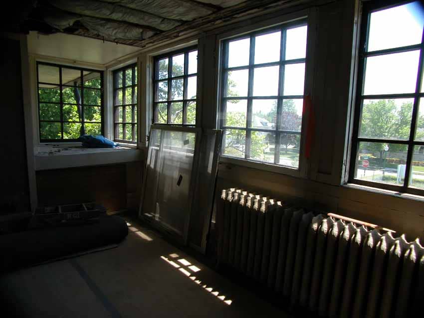 This is the living room. There used to be a row of radiators under the band of windows. The radiators were hidden in cabinets. They’ll be put back at a later date.