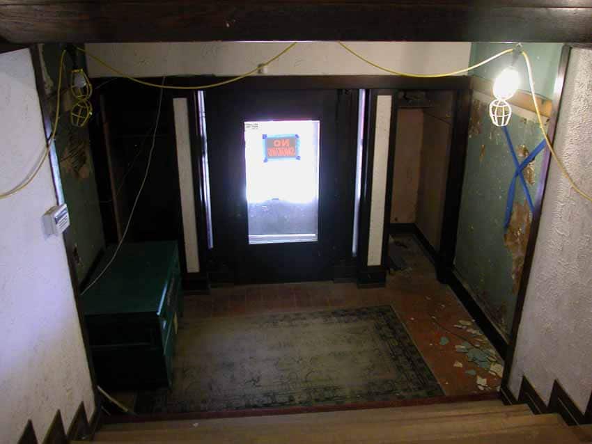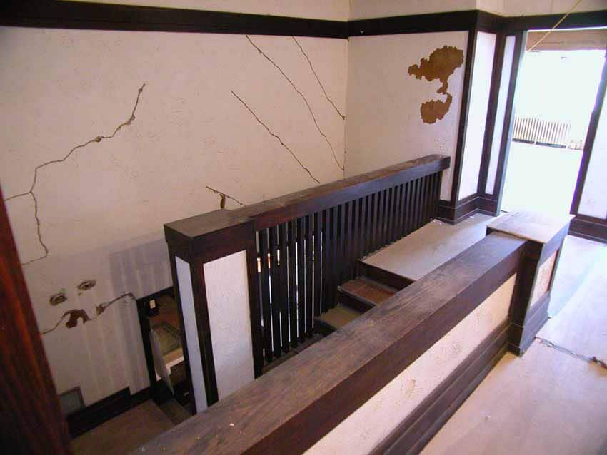 This is the main stairway. One of the main bedrooms is off to the right. The stairway is beautiful and quite well preserved. They grouved the plaster with a router to keep it from cracking and buckling when the home was stabilized and shored up. The sad part about this stairway is that a banister will have to be installed before it can be opened to the public.