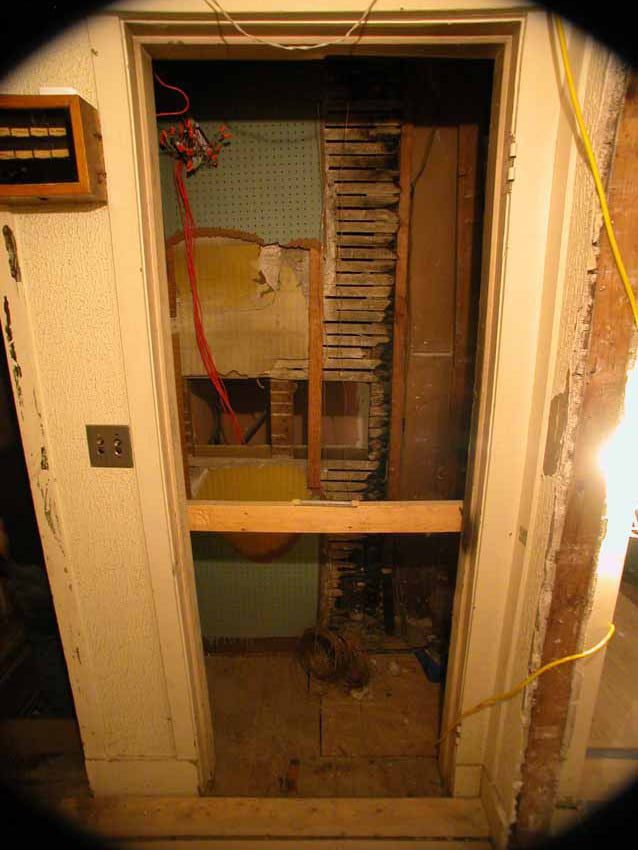 The servants’ stairway. On the lower left is the incinerator shaft. It is being restored to a stairway