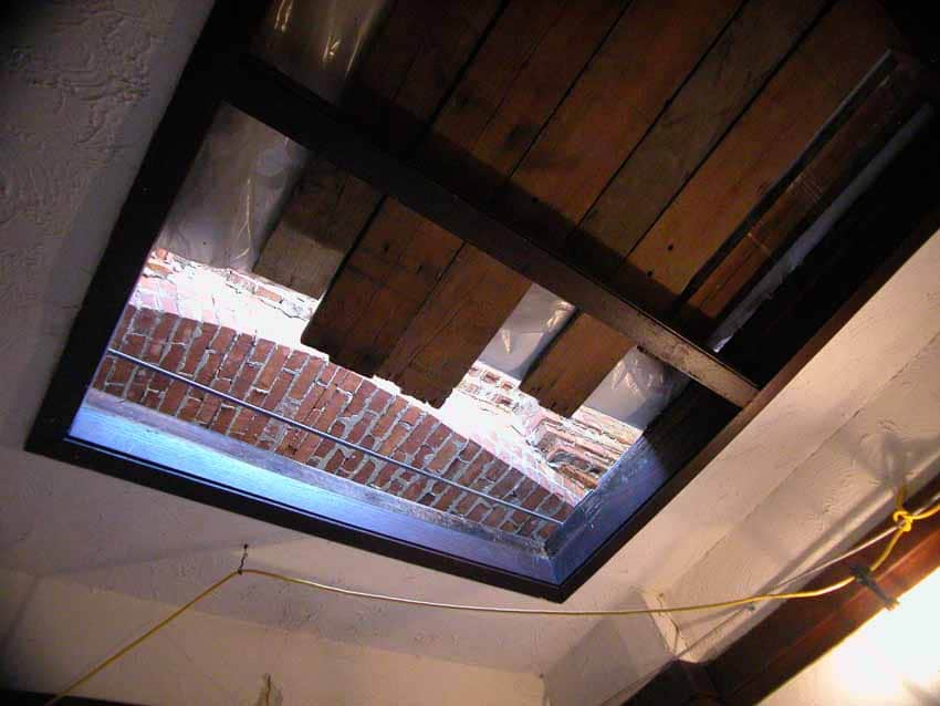 We’re upstairs now. This is a skylight that was boarded up. You can see a brick archway up in the skylight. The brick work tells me this was not intended to be seen… that it is just structural.