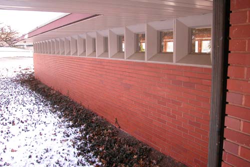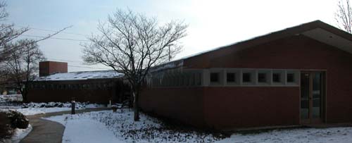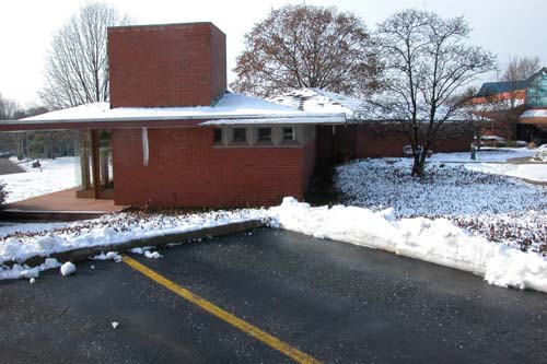The small windows on the right (North) contrast with the large plate glass windows on the left (South). The building actually looks very much like a Usonian house. Many of the design elements are similar.