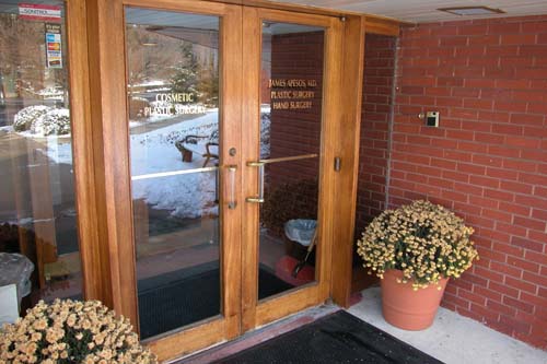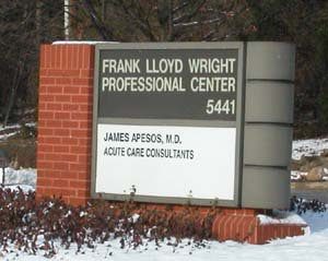 This sign is somewhat misleading. While the main office building for Dr. Apesos’ practice was designed by Wright, the main building that was added is definitely not Wright.