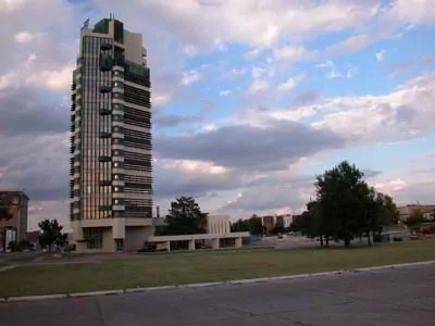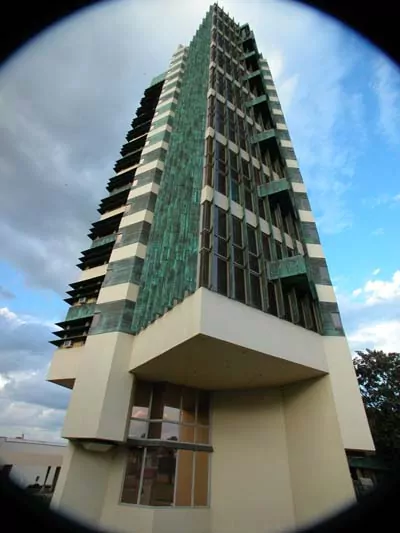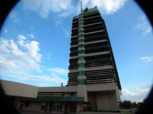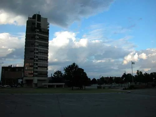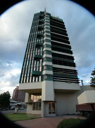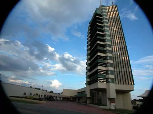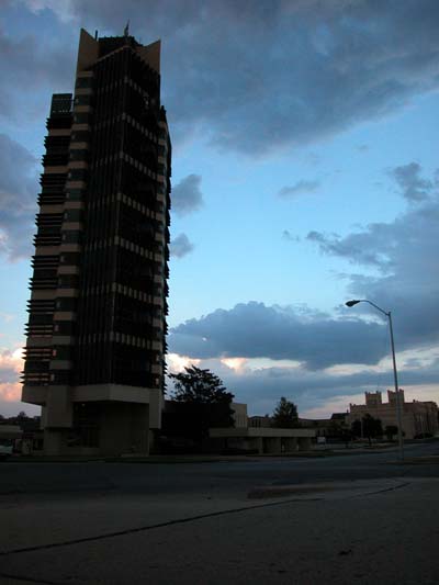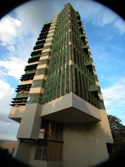This view shows off the cantilevered floors. The centralcore of the building is what gives it support. For that reason, the toweris able to have the second floor overhang significantly. It is a quitestriking visual affect that reminds me a lot of the S.C. Johnson Wax ResearchTower.