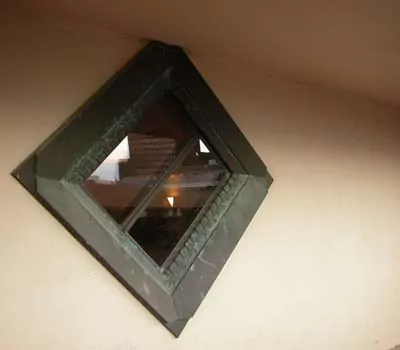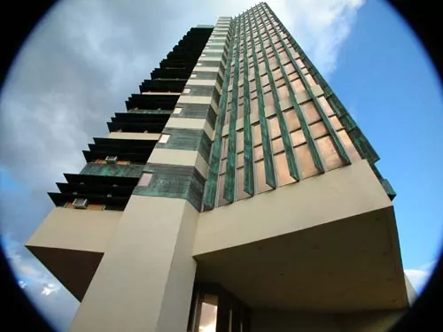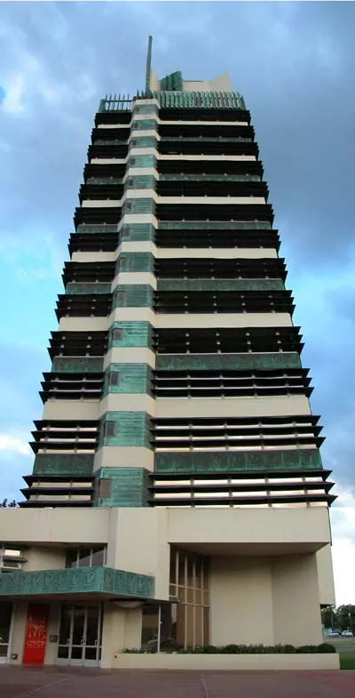 Price Tower was built as an apartment building. Itsconstruction is mostly poured, steel reinforced concrete. Each of thefloors are cantilevered. There are copper shutters and accents all overthe building which not only protect the rooms from the hot Oklahoma sun, butalso add a wonderful green patina to the building.