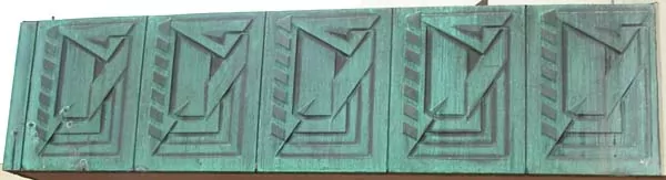 The green patina of the copper really adds color and distinctionto the building. The weathering looks completely different in thisclose-up of the panels above the entry than it does when you look at thebuilding from a distance. The color really fits well with the “amberwaves of grain” atmosphere that surrounds Bartlesville.