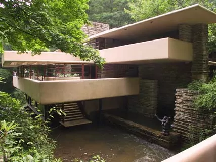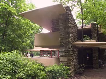 No examination of Frank Lloyd Wright’s work would be complete without an examination of his most famous building, Fallingwater. Built in 1936 for Pittsburgh department store magnate, Edgar Kaufman Sr. and his family, the home served as a summer getaway for many years. According to Thomas A. Heinz’ book The Vision of Frank Lloyd Wright Kaufman’s son, Edgar Jr. had read Wright’s autobiography and became a member of the Taliesin Fellowship. Though he didn’t spend much time in the fellowship, he did encourage his father to have Wright design their summer home.