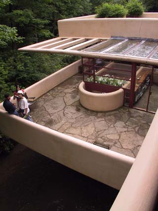 Taken from the bridge that leads to the house, this gives a great view of how the house hangs out over the water. In its original form, it was completely unsupported over the water. The house was anchored into the large rock in the side of the hill, and all the porches, patios and the living room were hung out over the waterfall.