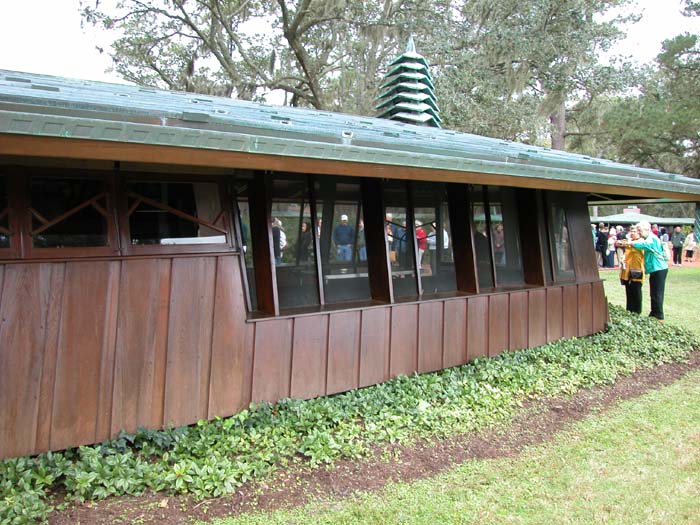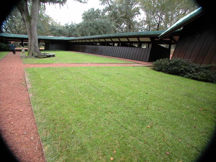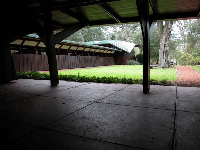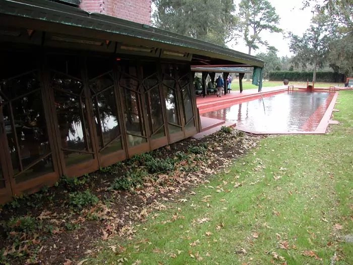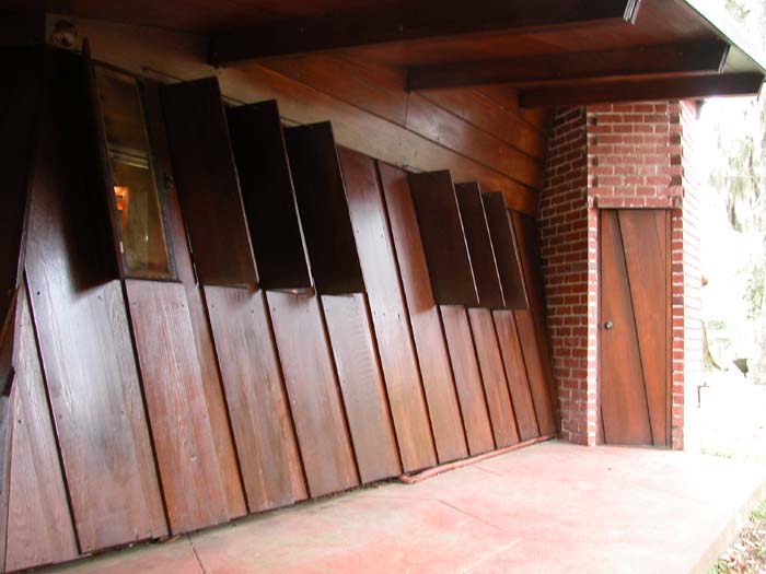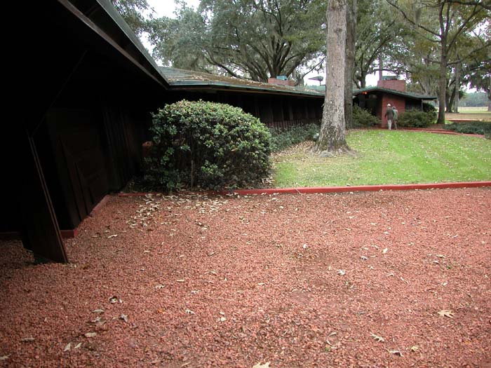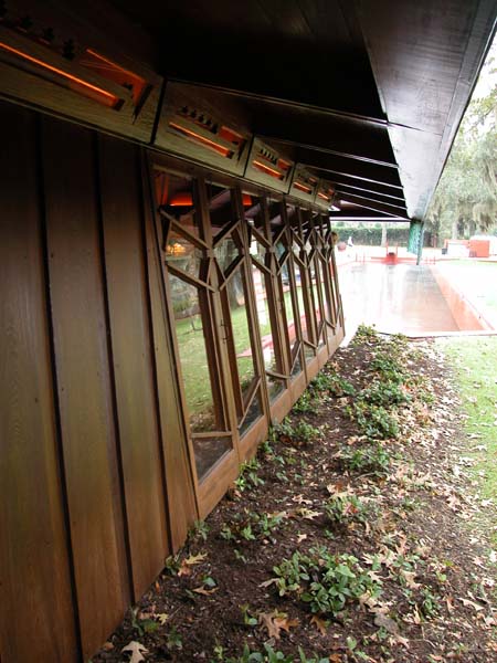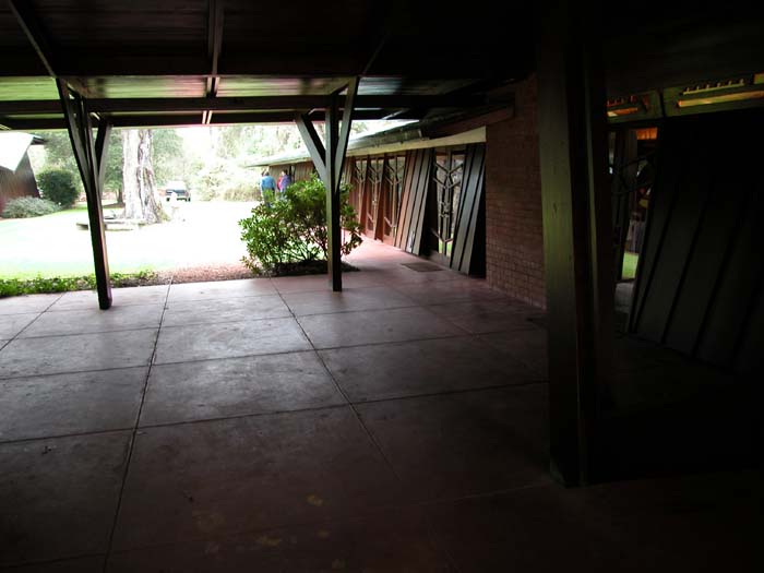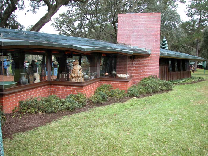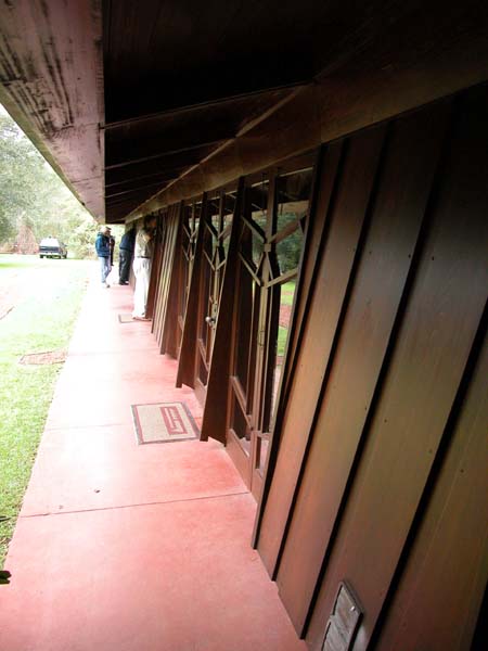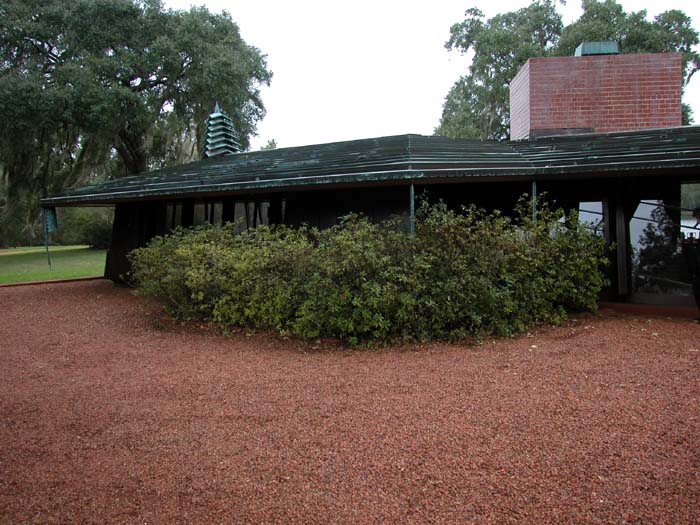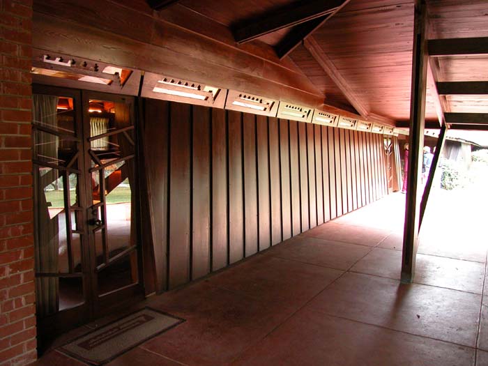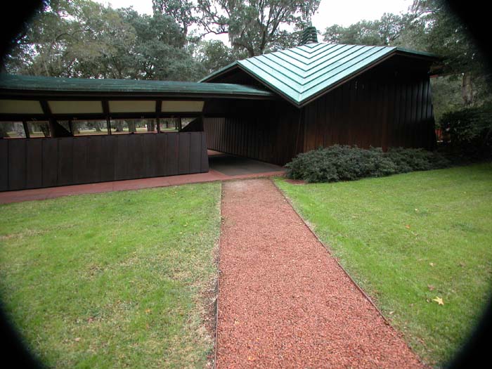 The driveway leading up to the house takes you past the kitchen, its screened-in porch, and the dining room before you get to the “front” door. The most noticeable element of the design is the copper roof. Wright used corrugated copper for the roof much like what is traditionally found on many southern homes. The difference is that Wright oriented the ridges in concentric, horizontal rings around the building. This emphasizes the horizontal lines rather than the vertical. Copper spires top many of the buildings on the grounds. The photo above shows the spire on the porch outside the kitchen. The original roof was made with copper that was way too thin. It was all that was available during the 1930s. In fact, many people marveled that Wright was able to get copper for this home at all due to the need for resources to wage World War II.