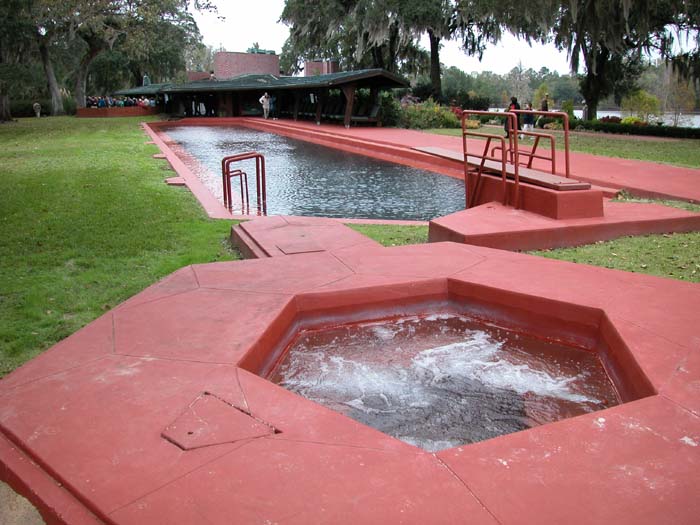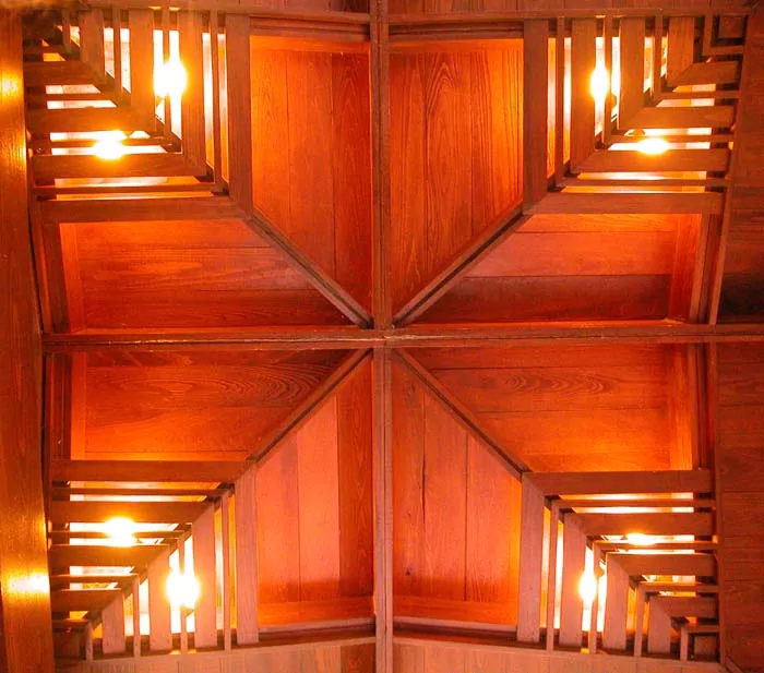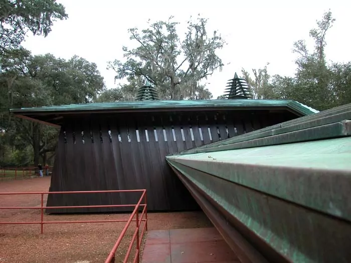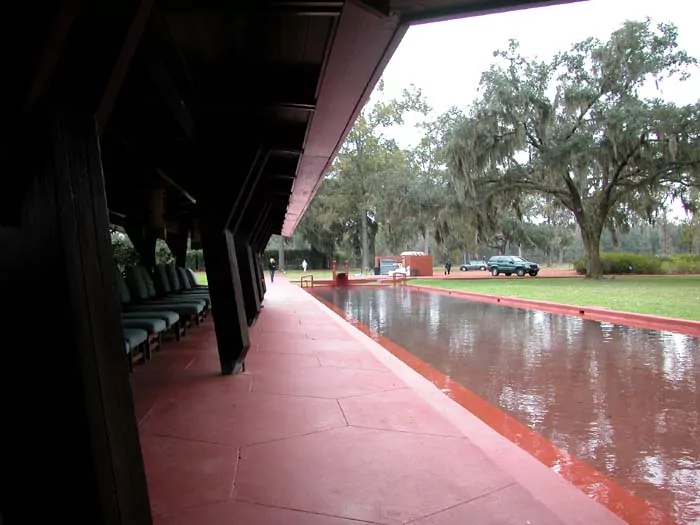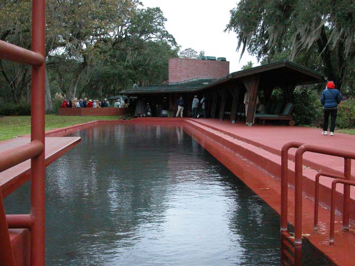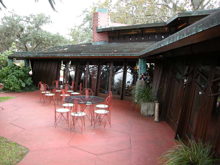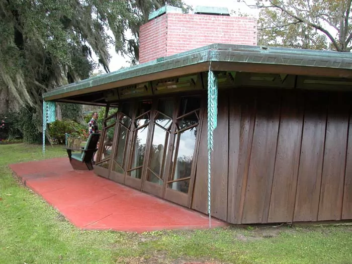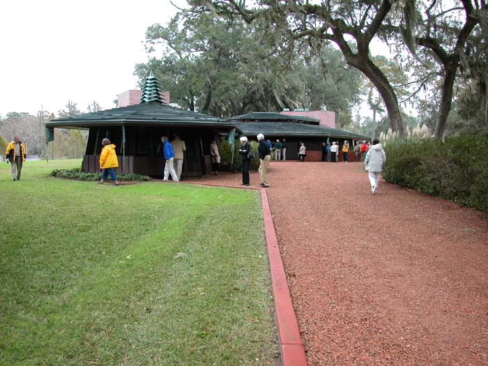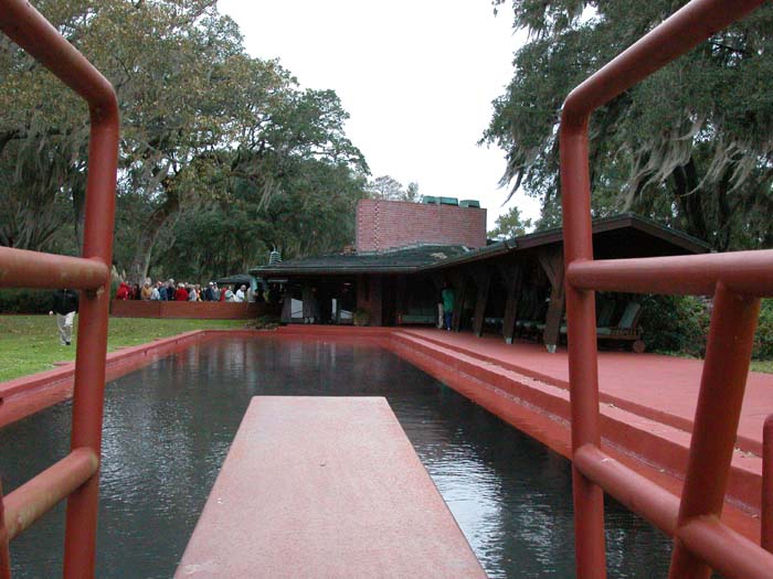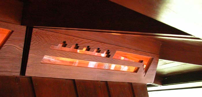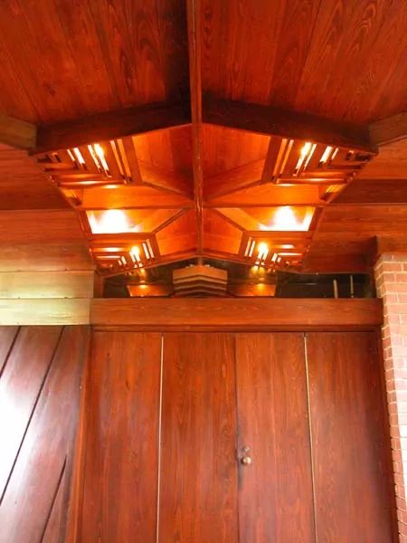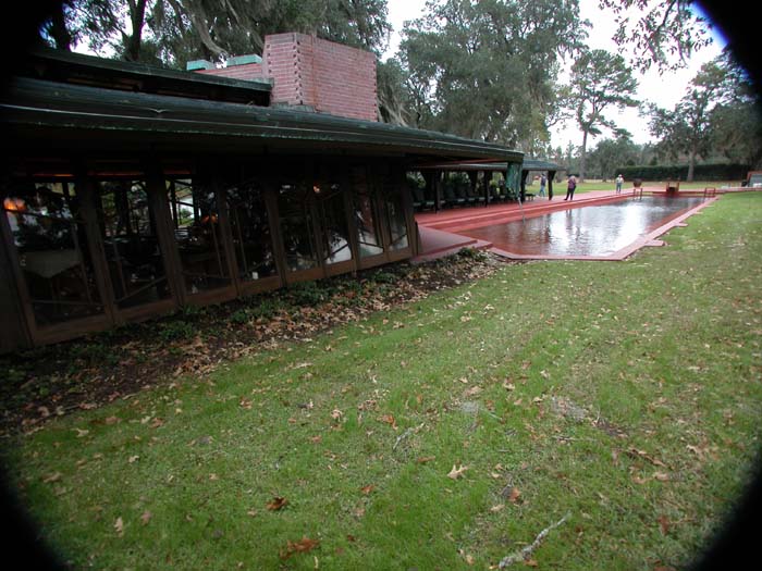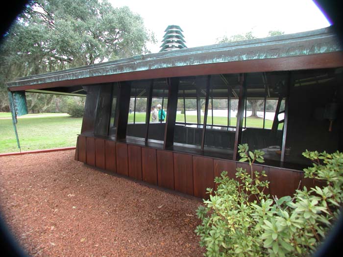 The driveway leading up to the house takes you past the kitchen, its screened-in porch, and the dining room before you get to the “front” door. The most noticeable element of the design is the copper roof. Wright used corrugated copper for the roof much like what is traditionally found on many southern homes. The difference is that Wright oriented the ridges in concentric, horizontal rings around the building. This emphasizes the horizontal lines rather than the vertical. Copper spires top many of the buildings on the grounds. The photo above shows the spire on the porch outside the kitchen. The original roof was made with copper that was way too thin. It was all that was available during the 1930s. In fact, many people marveled that Wright was able to get copper for this home at all due to the need for resources to wage World War II.