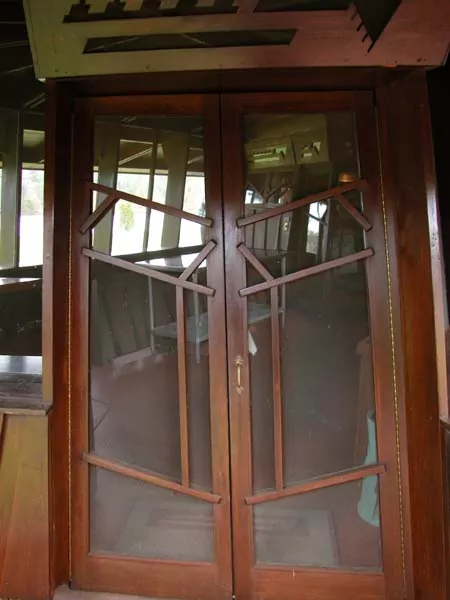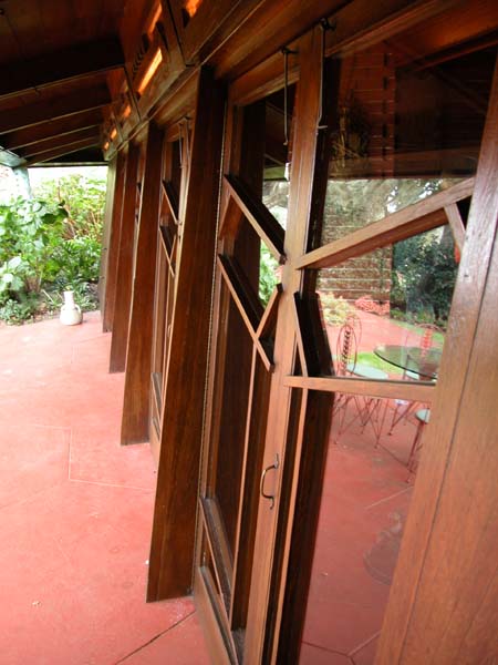 Much of the house is surrounded by glass. Many of the doors and windows have this sort of ornamental wood work around them. In all of the cases, the woodwork is used as door or window handles for opening and closing the doors and windows. What is interesting about the external walls on this home is that none of them are vertical. This gives the home a very interesting look. All of the doors open up and out because of this. I imagine that you could easily slam a door if you accidentally let go of it after entering or leaving. The lack of vertical external walls makes the home really appear to be grounded on the lot.