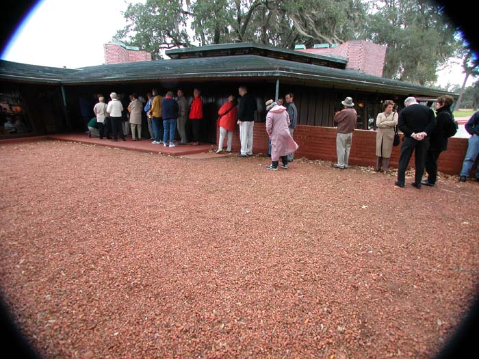 This is the line to get into the house for the tour. The living room is front and center in this photo. You get a little view of the roof here too. It is copper, like many of the homes built at this time in the area. Wright lined the corrugations in the copper roof around the house instead of up and over the roofs like homes designed by other architects. There is no insulation in the roof at all. That makes the fireplaces very important in the winter. It sometimes gets down into the 30s at night around here, so it would be pretty chilly to get out of bed in the morning.