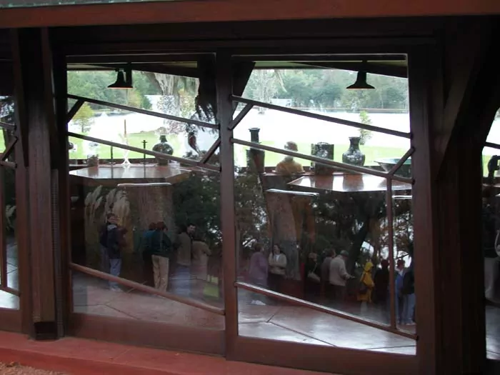 There is a hexagonal modular table in the living room along with a few matching chairs. As with many Wright homes, there was a large piano in the living room. There is a wine urn in the fireplace just like the one at Fallingwater.