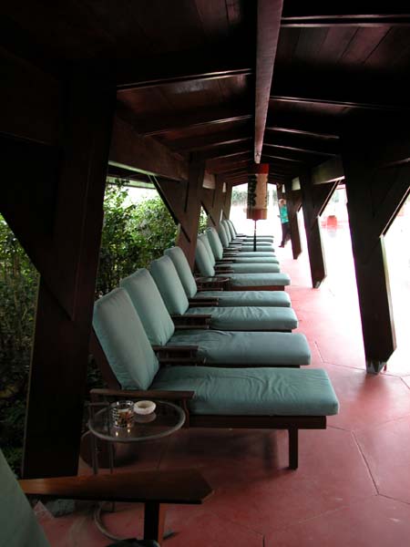 The dining room is in a narrow wing that goes between the entry way and the kitchen. It is glassed in on both sides. The courtyard side has glass doors that open so that dining can be done outside. The tables are hexagonal and can be either incorporated into the wall as you see here, or put together into one long table.