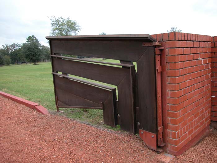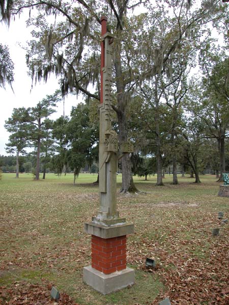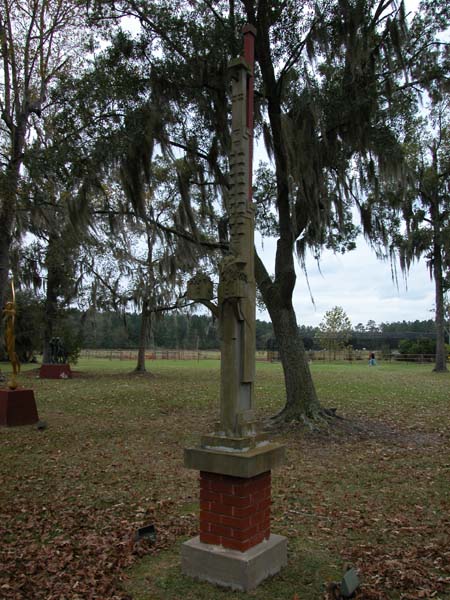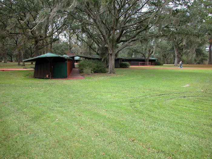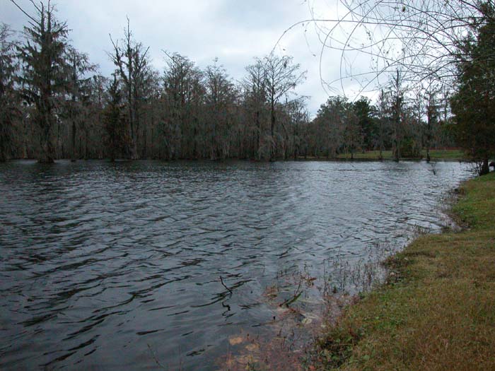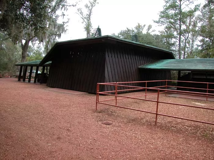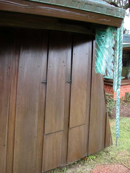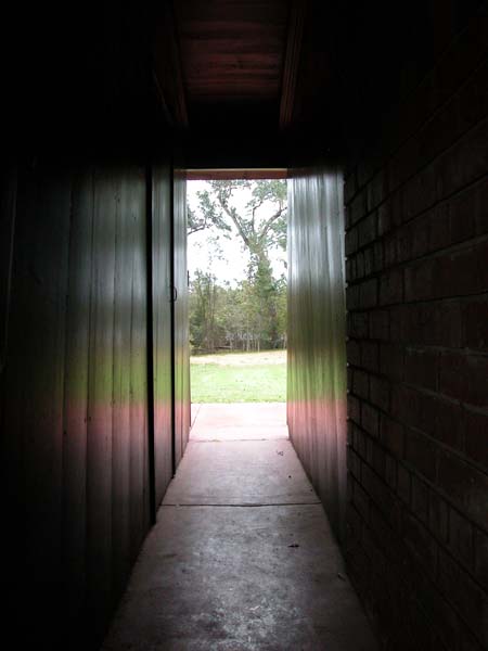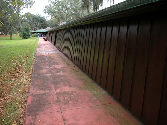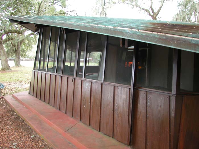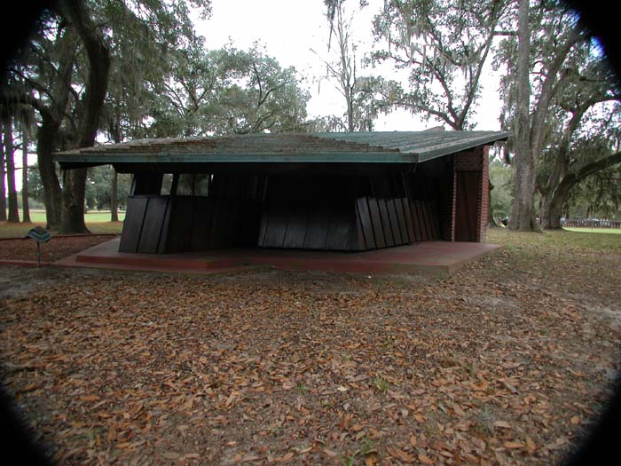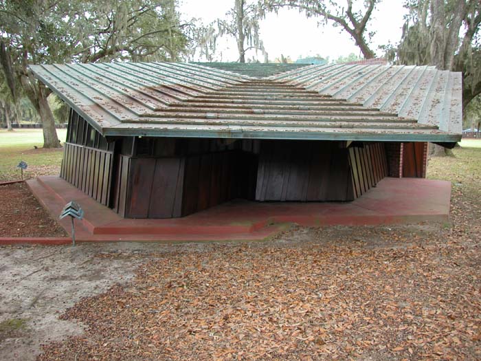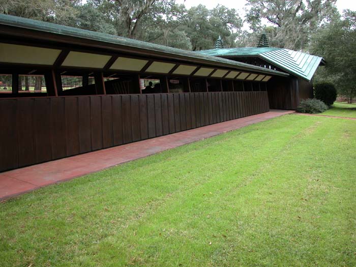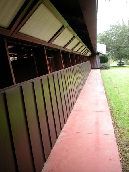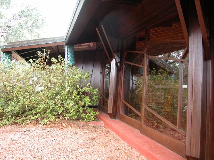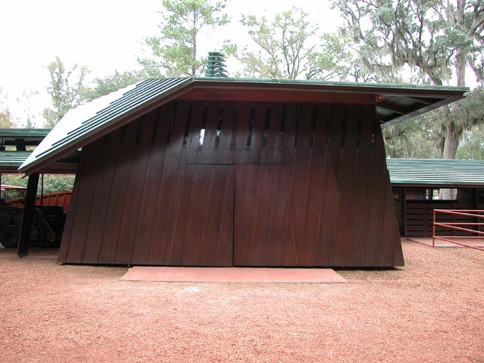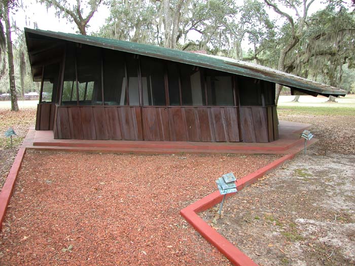 The main house is built near the lake. The view from the dining room and bedrooms is very beautiful. A beautiful grove of cypress trees matches cypress wood that makes up the exterior and interior walls of the house. Brass screws and fittings were used to hold the board and batten together. The home and most of the buildings are built on a hexagonal grid. Most angles are either 60 or 120 degrees. The home is built on only one level, so all of the ceilings in the home are vaulted.