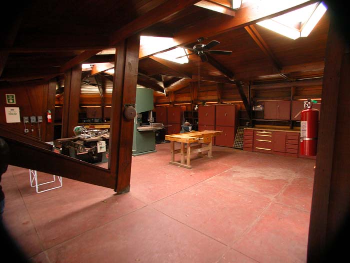 The living room is long and has a vaulted ceiling with clerestory windows high on the roof line. The walls are cypress as are the roof boards. There are built in benches and book cases that surround the living room. It was interesting to see 4 Oscars sitting on the shelf. There were also some beautiful scale models of early Ford cars.